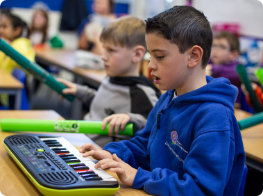 Class Jam, taught across Keystage 1 will build on pupil's musical skills using 5 different instruments: Chime bars, African Drums, Boomwhackers Keyboards and percussion. Pupils will have the opportunity to switch instruments each week, so they are able to feel confident in how to play all the instruments by the end of the course. Pupils on the Chime bars, and keyboards will play simple, 1 part melodies, pupils playing the boomwhackers will accompany them playing chords, and pupils on percussion will play varying rhythms underneath. The course aims to have pupils playing different songs as a class orchestra. This course builds pupil's confidence in reading and following music as well as learning the important skill of listening to others when playing. These two key skills will help them in all aspects of music throughout their musical education.